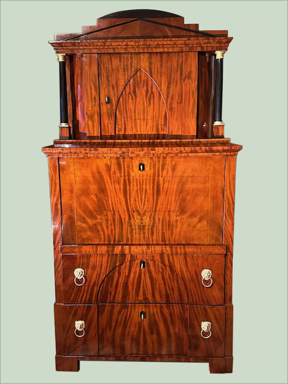Spitzgiebel, freistehende Vollsäulen eingestellt, Messing-Kapitäle und Bassen, Geheimfächer