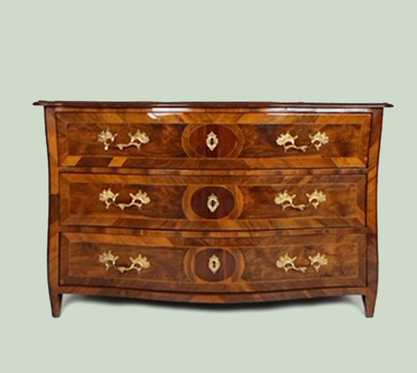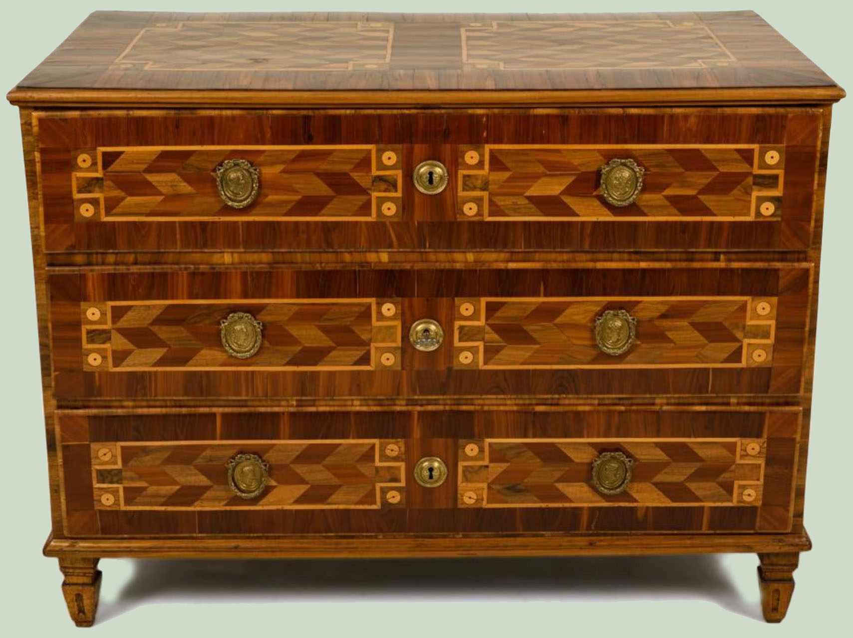 Louis Seize Kommode, Nussbaum furniert, wohl von Hopfengärtner, Schweiz um 1780, original Beschläge, feine Einlegarbeiten, Mäandermusterung, sehr schönes gespiegeltes Furnierbild, Restauriert und Schellack handpoliert