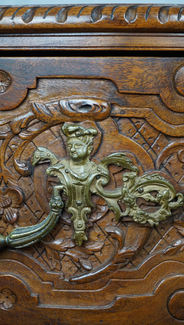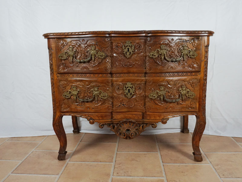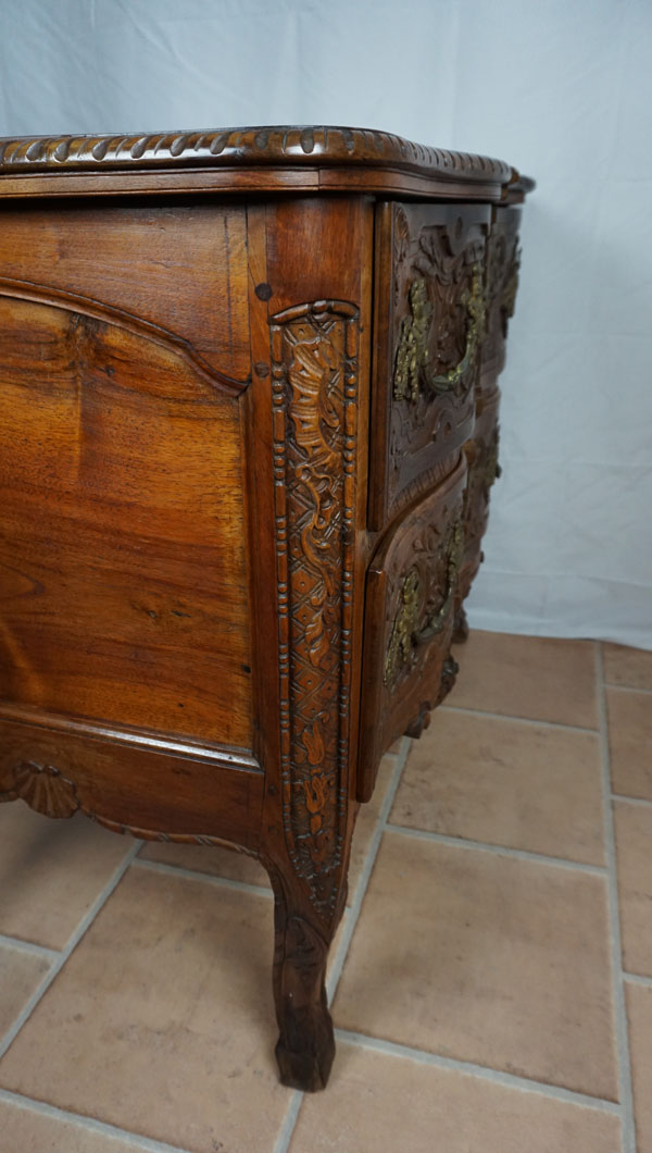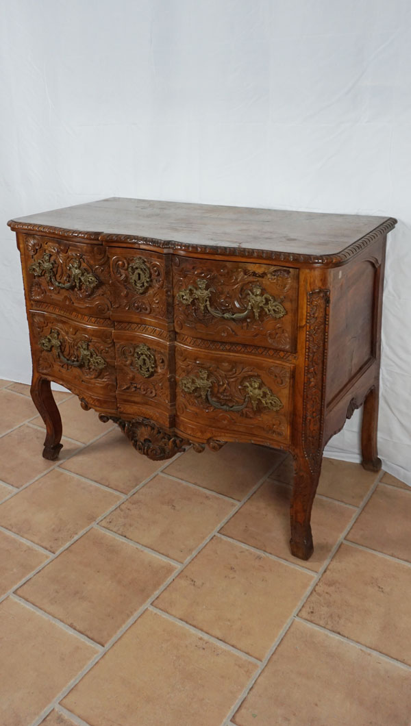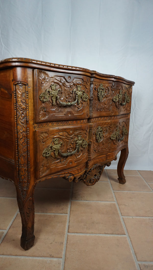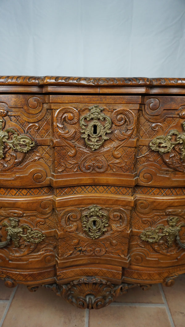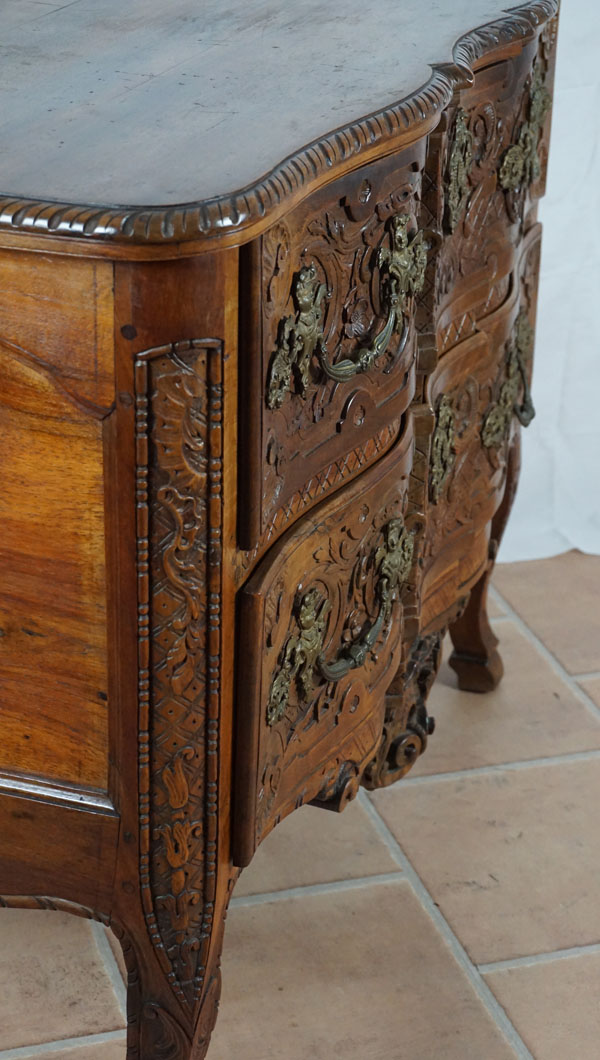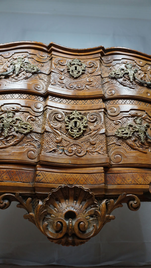 The emphasis on carved solid wood, together with the choice of material and stylistic characteristics, suggests production in a French provincial workshop. In contrast to contemporary Parisian furniture, the use of veneers and dominant gilt-bronze mounts is reduced in favour of a more pronounced expression of craftsmanship in the carved wood. Stylistic parallels point in particular to southwestern France as a possible place of origin, while other prosperous provincial regions may also be considered.