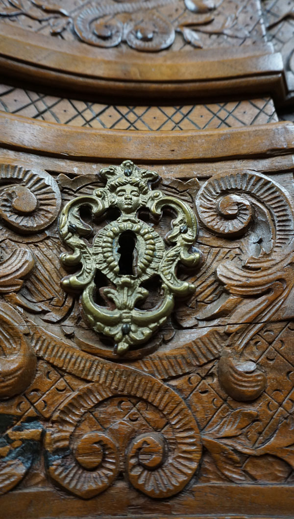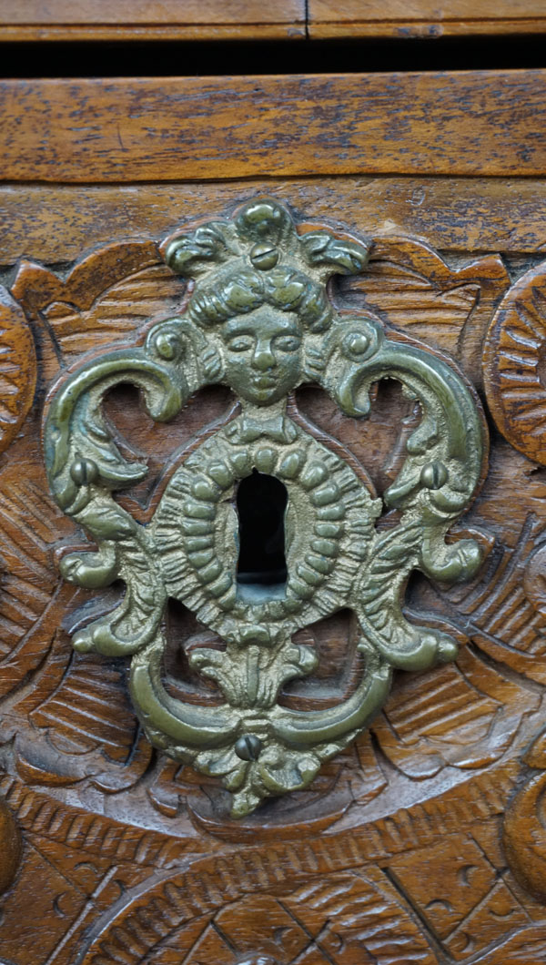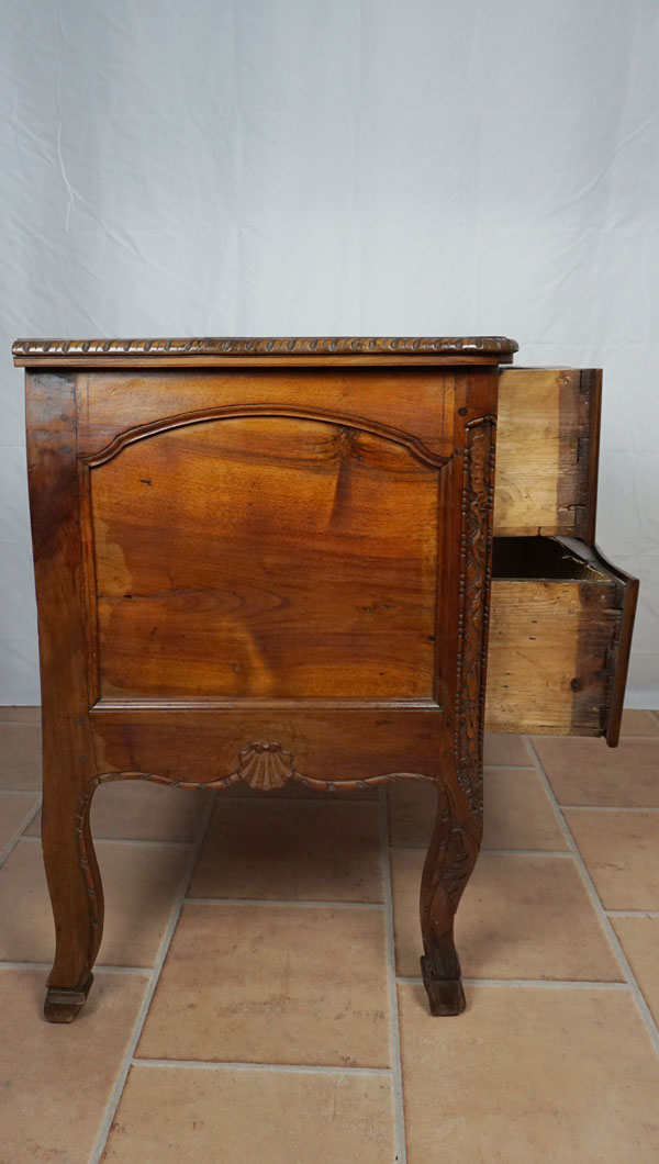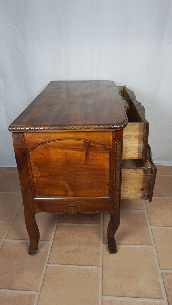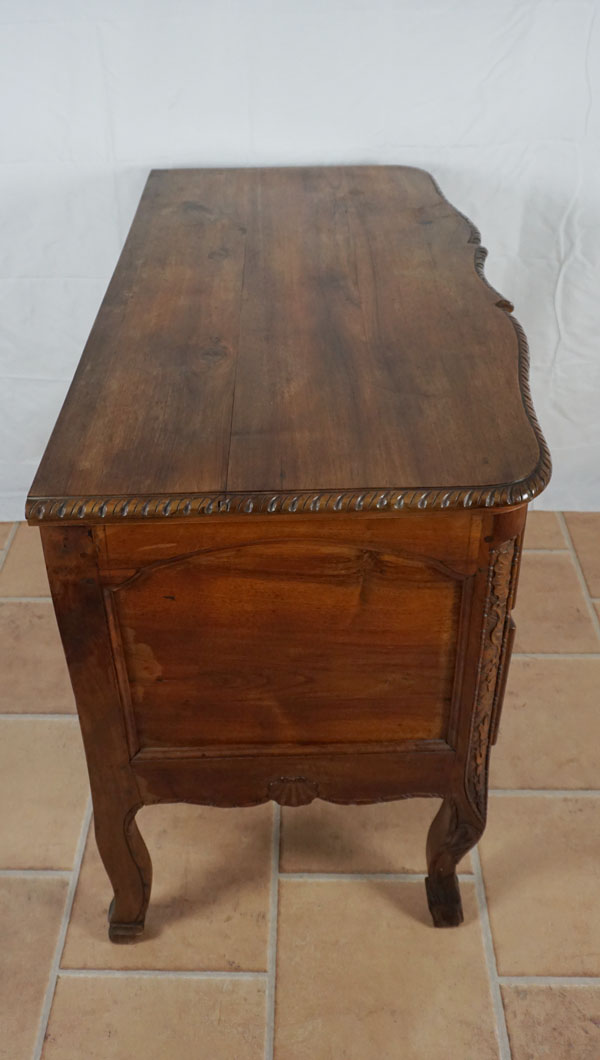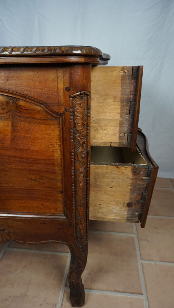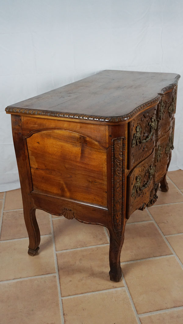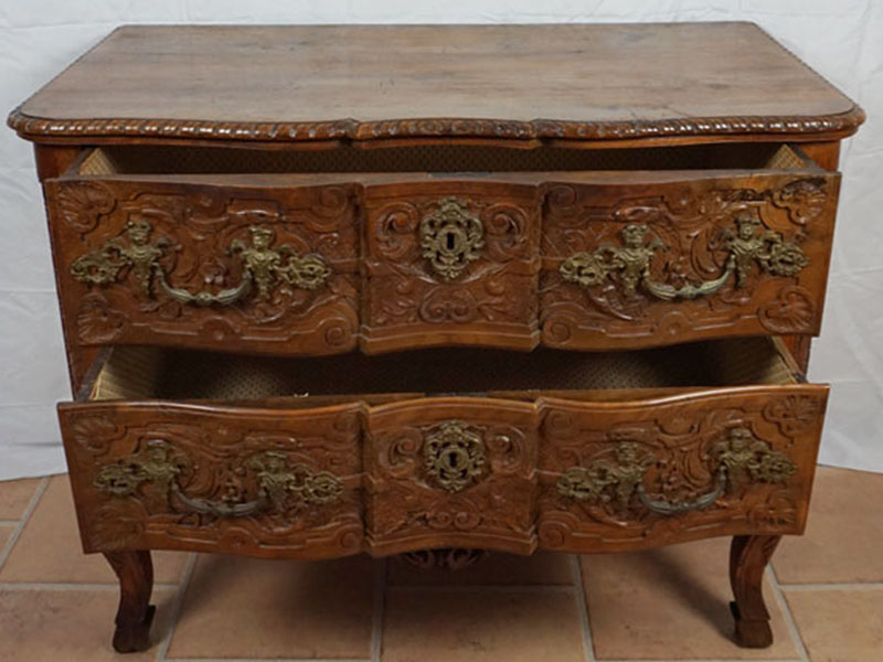 The emphasis on carved solid wood, together with the choice of material and stylistic characteristics, suggests production in a French provincial workshop. In contrast to contemporary Parisian furniture, the use of veneers and dominant gilt-bronze mounts is reduced in favour of a more pronounced expression of craftsmanship in the carved wood. Stylistic parallels point in particular to southwestern France as a possible place of origin, while other prosperous provincial regions may also be considered.