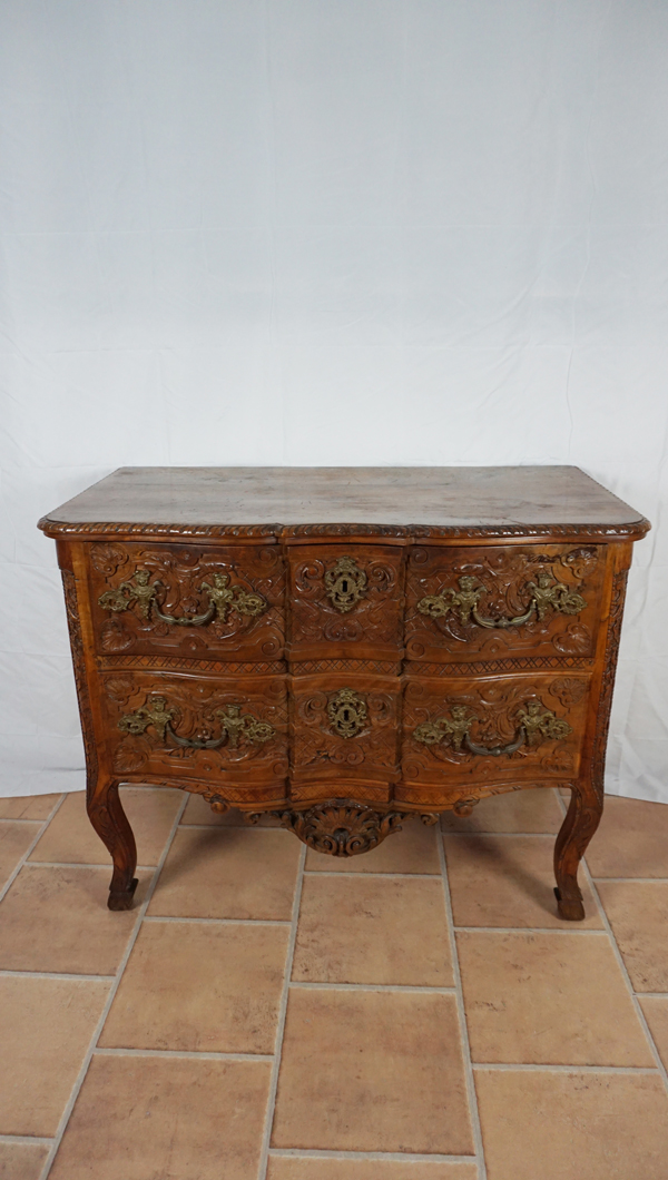 The chest of drawers is a French piece of furniture dating from the 18th century and can be attributed to the Louis XV style. It is made of solid walnut and features a slightly bombé front, curved cabriole legs, and richly executed, deeply carved wood ornament. The original gilt-bronze mounts are finely worked and harmoniously integrated into the overall design.